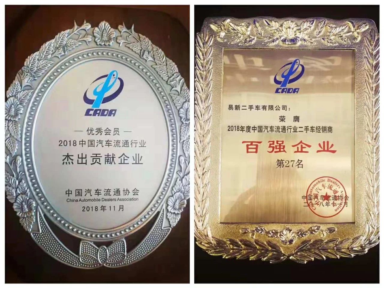 盈众汽车集团荣获2018中国汽车流通行业杰出贡献奖;易新二手车荣膺2018年度中国汽车流通协会二手车经销商百强企业第27名。