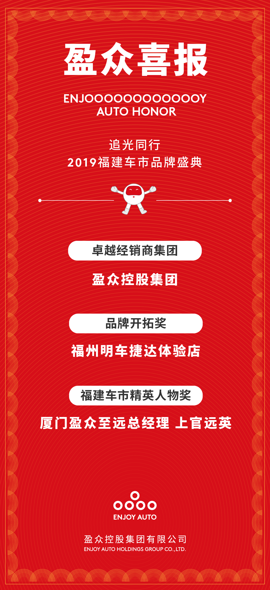 荣耀加冕,拥着梦想追光前行。面向未来,盈众将继续秉承“用科技和文化,让人们的汽车生活更美好”的企业使命,为广大客户提供更丰富、更具想象力的美好车生活服务。
