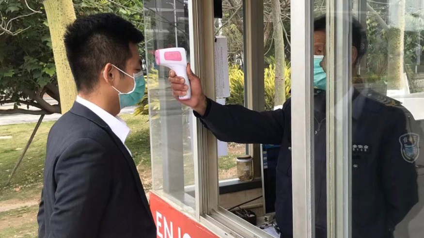 ▲员工上岗戴口罩,进行体温检