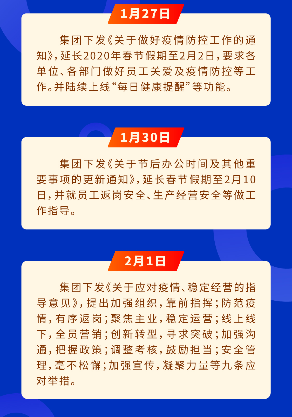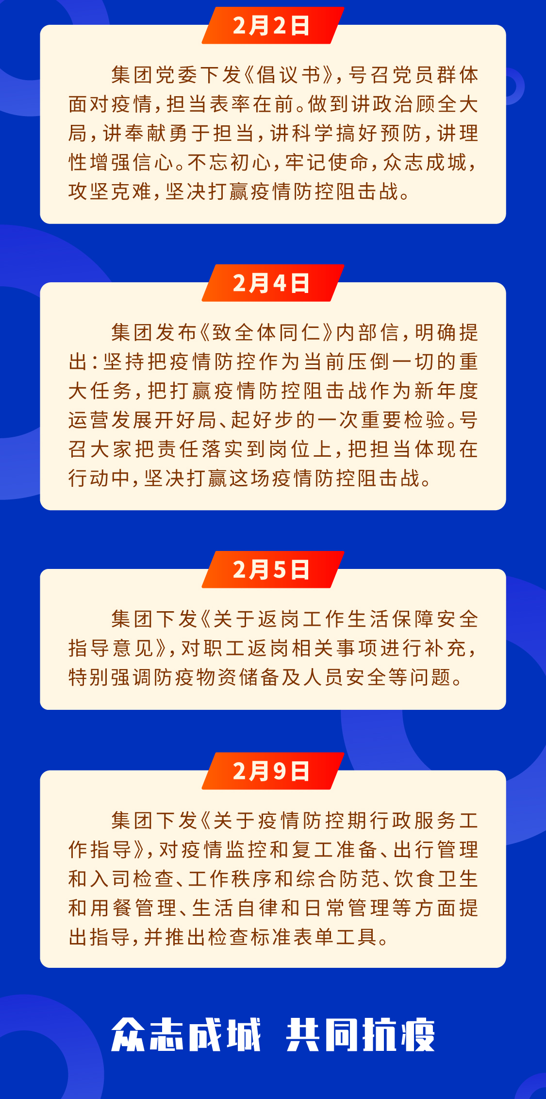 张总多次对工作小组强调:“疫情防控最重要是优先确保员工和客户的平安健康”。陈主任表示,基层一线是对外服务的窗口,是防控工作重中之重,集团全体同仁多一分担当,员工的安全就多一分保障,我们的客户和家人就多一分安康。