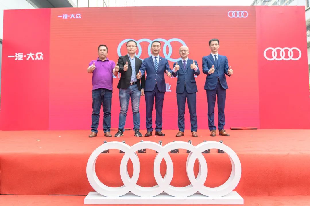 一汽-大众奥迪销售事业部东南区区域主管销售经理叶鹏、一汽-大众奥迪销售事业部东南区区域服务与二手车经理包洋、厦门盈众至远汽车销售有限公司总经理严劲松等,共同为厦门盈众奥迪前埔店全新数字化体验中心剪彩庆贺。精彩纷呈的舞狮表演将现场气氛推向高潮。