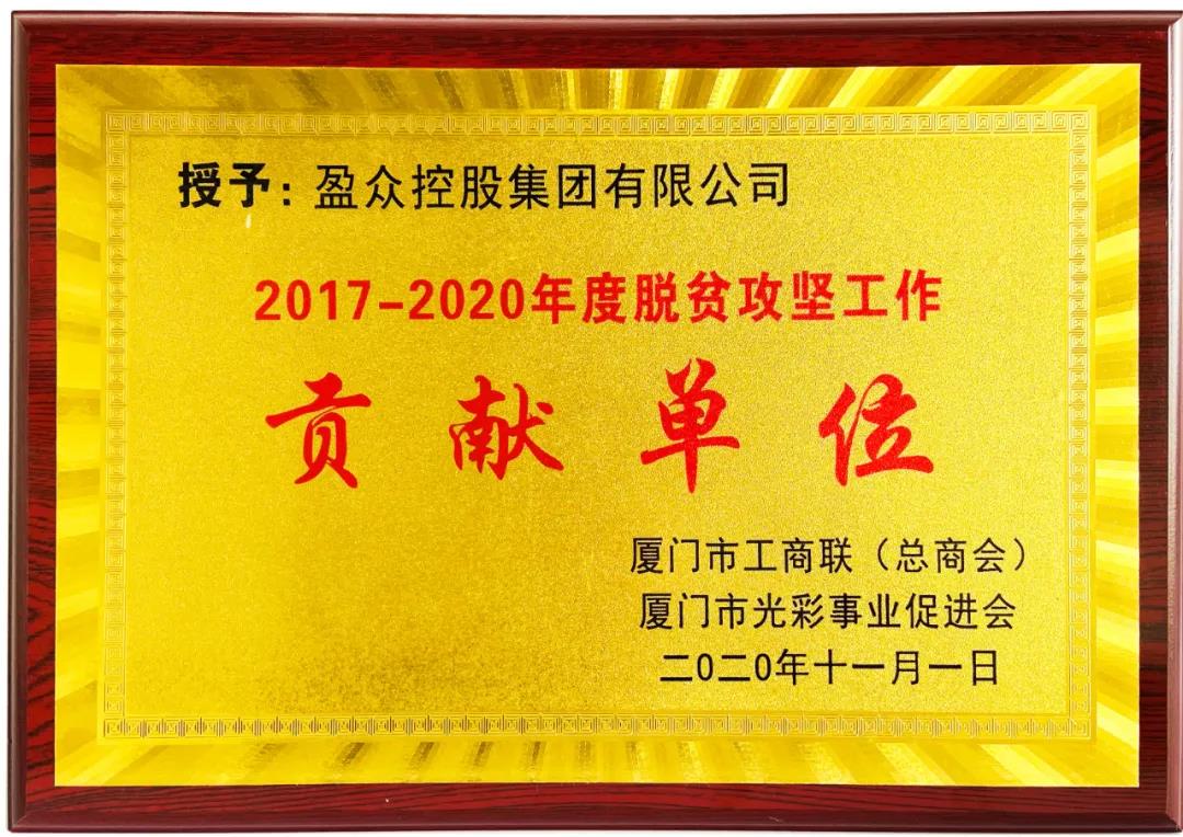 集团荣获由厦门市工商联(总工会)、厦门市光彩事业促进会共同颁发的“2017-2020年度脱贫攻坚工作贡献单位”荣誉,表彰盈众多年来持续关注脱贫攻坚事业,积极开展向甘肃临夏州定向捐资精准扶贫、线上助农义卖活动等举措,为脱贫攻坚做出自己的贡献。