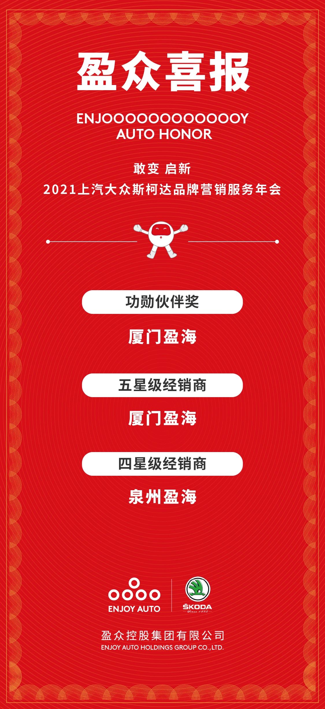 【喜报】盈众荣获2021上汽大众斯柯达功勋伙伴奖、五星级经销商等多项大奖 2021-02-09 盈众控股集团 11441次浏览 2月9日,“敢变 启新 2021上汽大众斯柯达品牌全国营销服务年会”通过线上直播的形式召开。全国上汽大众斯柯达经销商通过网络直播,共同回顾2020年奋进的足迹,凝心聚力,坚定信心,迈向2021。 盈众控股集团凭借2020年出众的销售业绩、高标准的服务水平以及优秀的企业经营能力,荣获多项大奖。其中,厦门盈海获得上汽大众斯柯达品牌功勋伙伴奖,并第12次获得五星级经销商荣誉称号,泉州盈海荣获四星级经销商荣誉称号。 2020年,盈众斯柯达团队以坚韧不拔的意志和乘风破浪的勇气,拼搏奋进,再创佳绩。这离不开每一位盈众人的付出,更离不开每一位客户的关注与支持。 盈众控股集团将始终秉持“用科技和文化,让人们的汽车生活更美好”的企业使命,始终以客户为中心,持续为客户提供汽车全生命周期的优质服务,开拓进取,不断超越,为广大客户创造更加美好的汽车生活。 点赞 0 上一篇 下一篇