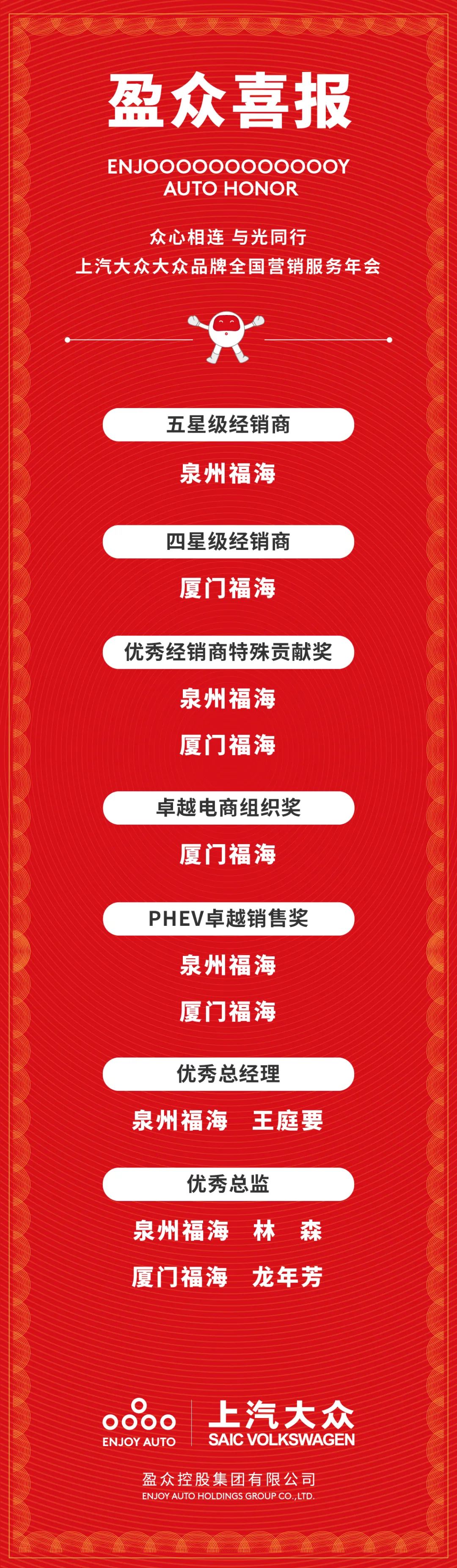 年会上,盈众上汽大众团队荣获“五星级经销商”“优秀经销商特殊贡献奖”等多项荣誉,其中泉州福海连续七年蝉联“五星级经销商”荣誉,“卓越电商组织奖”“PHEV卓越销售奖”也体现了盈众上汽大众团队紧跟市场发展,创新营销服务,以及在新能源汽车销售服务方面的实力。