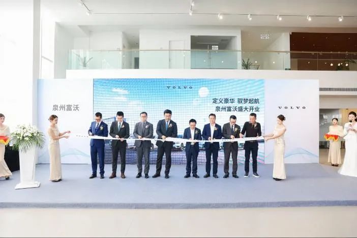 沃尔沃汽车大中华区销售公司南区总监梁学志、经销商网络发展高级经理万维巍、经销商网络发展南区区域经理黄训华、南区销售区域经理皮先波,盈众控股集团常务副总裁易远航、副总裁尤猛杰、盈众红鼎集团董事长邱晨阳,以及福建省晋江市新塘汽车销售行业协会会长王清强共同为盈众沃尔沃泉州富沃开业剪彩。