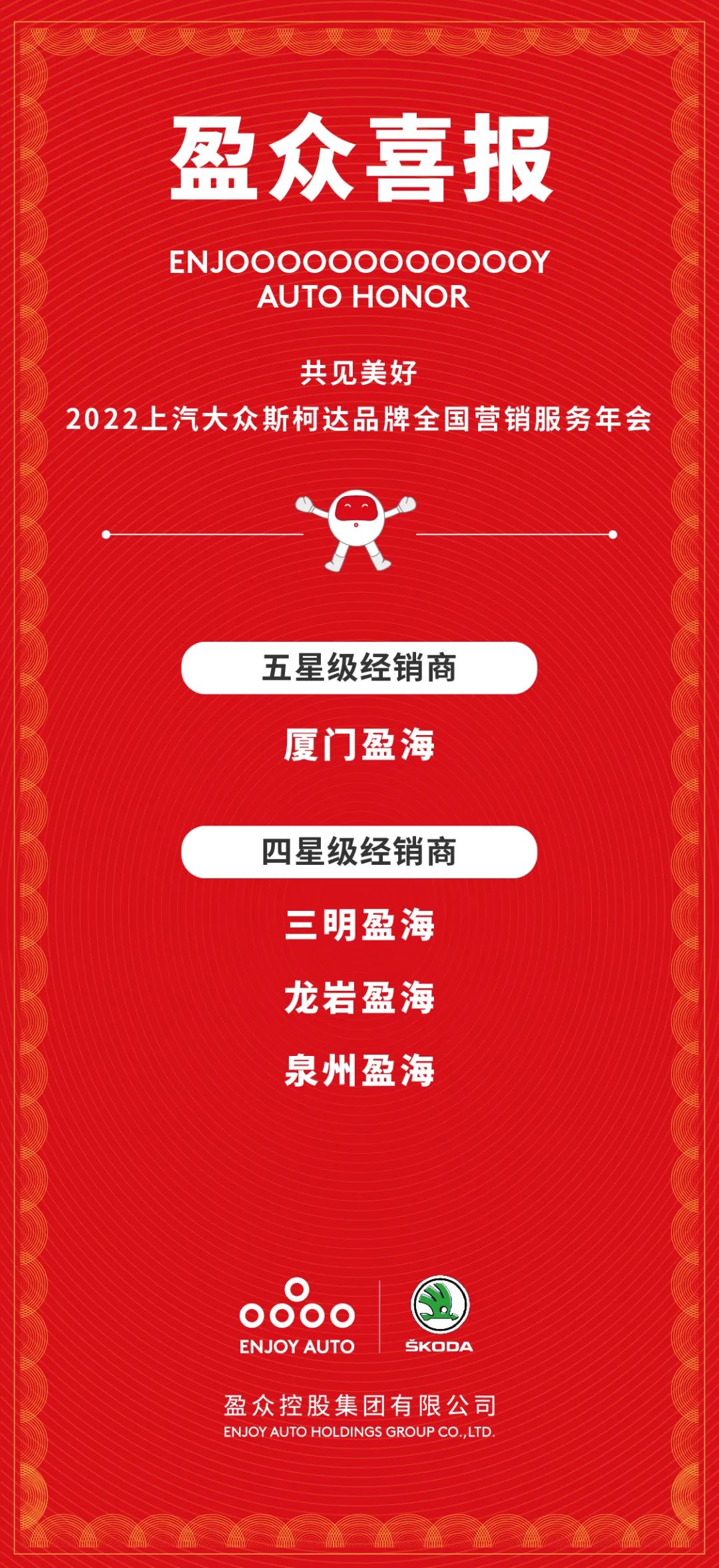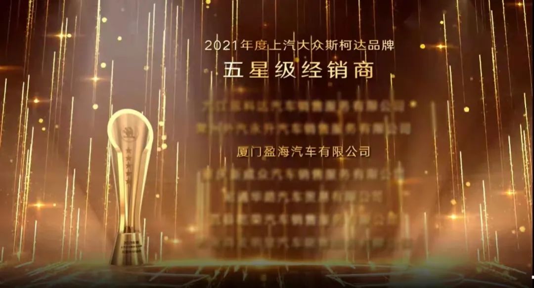 盈众控股集团凭借2021年出众的销售业绩、高标准的服务水平以及优秀的企业经营能力,荣获多项大奖。其中,厦门盈海再获上汽大众斯柯达品牌五星级经销商荣誉称号,这是厦门盈海第13次获得五星级经销商荣誉称号,三明盈海、龙岩盈海、泉州盈海荣获四星级经销商荣誉称号。