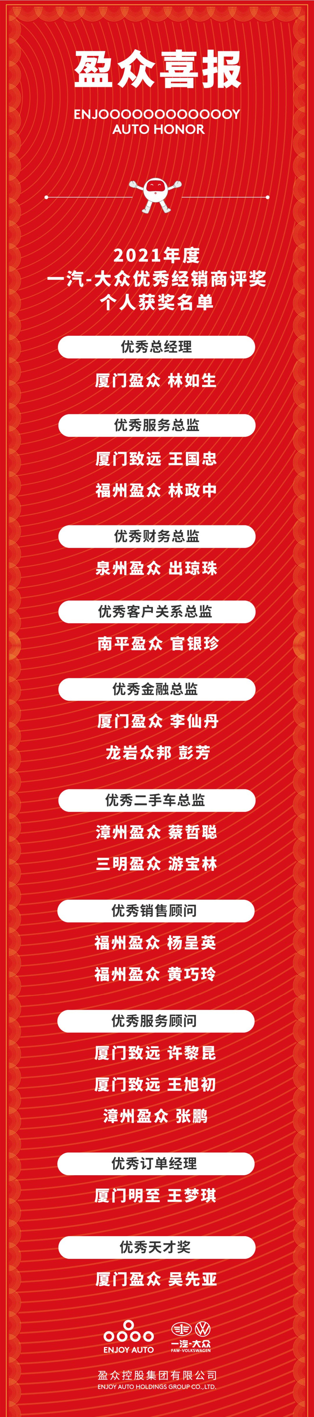 盈众一汽-大众4S店多个业务岗位的多名优秀员工也在本次评奖中获得了个人表彰。