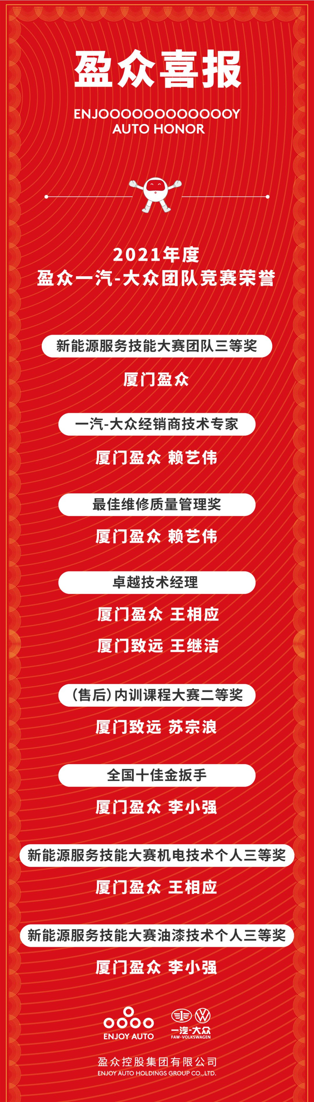 2021年,盈众一汽-大众团队在一汽-大众全国新能源技能大赛等各类竞赛中,也取得了优异的成绩。
