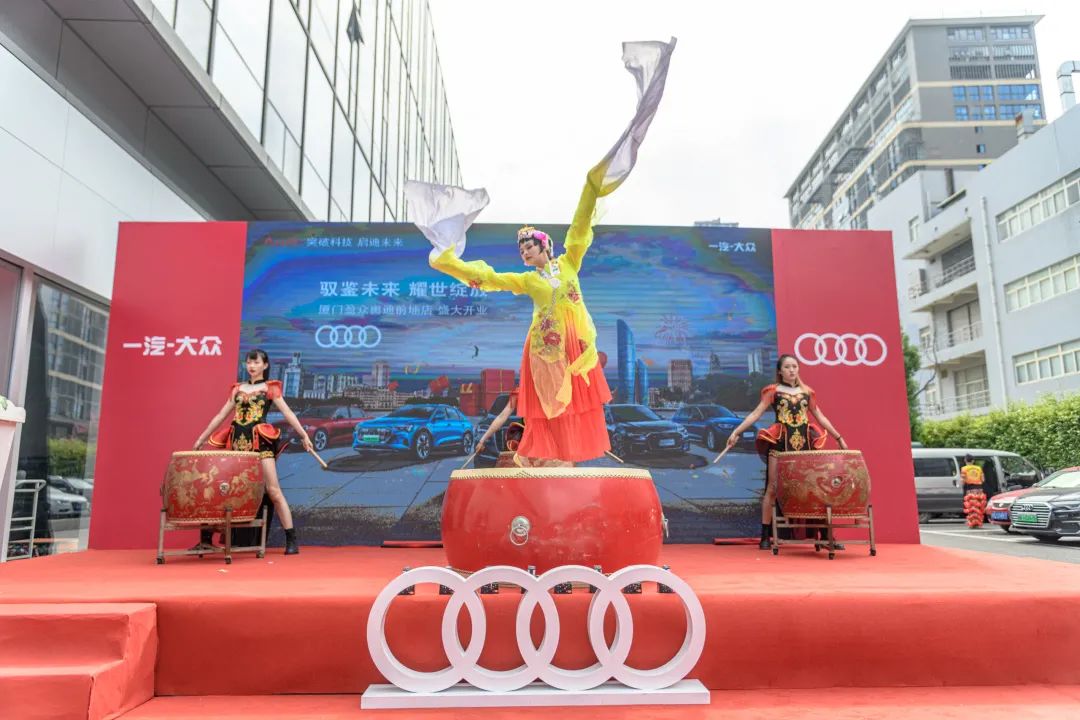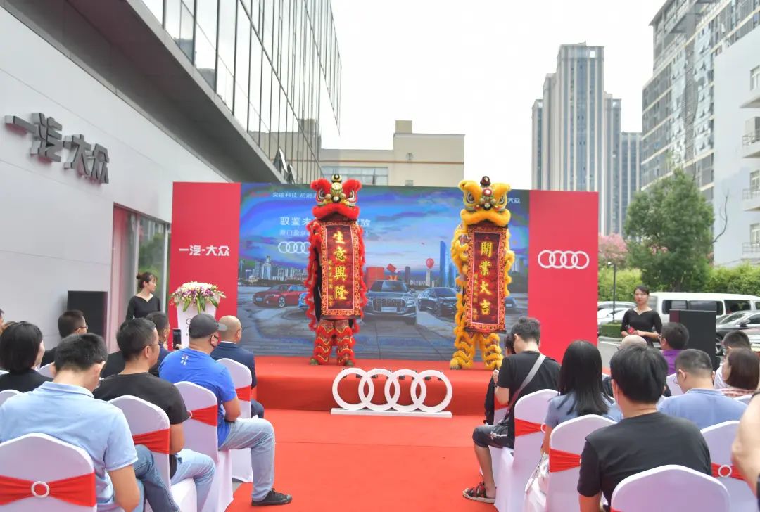 一汽-大众奥迪销售事业部东南区区域主管销售经理叶鹏、一汽-大众奥迪销售事业部东南区区域服务与二手车经理包洋、厦门盈众至远汽车销售有限公司总经理严劲松等,共同为厦门盈众奥迪前埔店全新数字化体验中心剪彩庆贺。精彩纷呈的舞狮表演将现场气氛推向高潮。