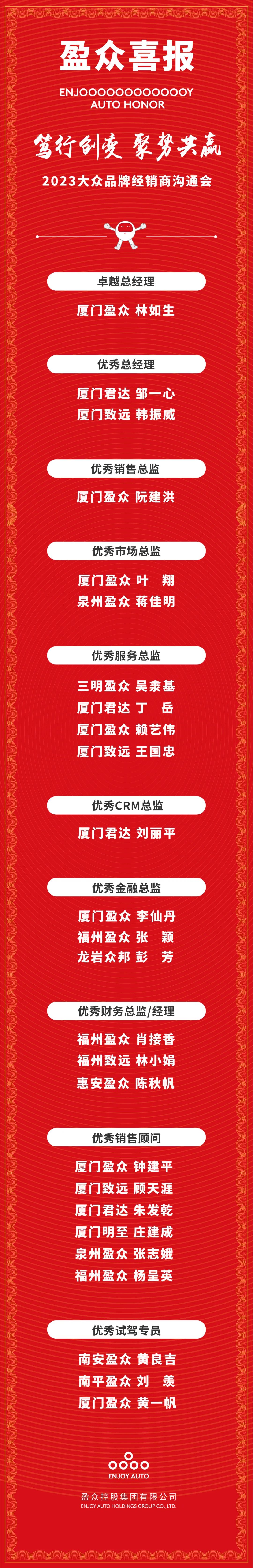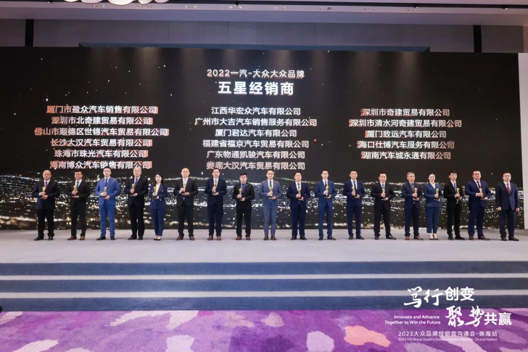 2月7日,以“笃行创变 聚势共赢”为主题的2023一汽-大众大众品牌经销商沟通会在广东珠海举办,2022年度一汽-大众优秀经销商及个人获奖名单新鲜出炉。盈众一汽-大众团队以