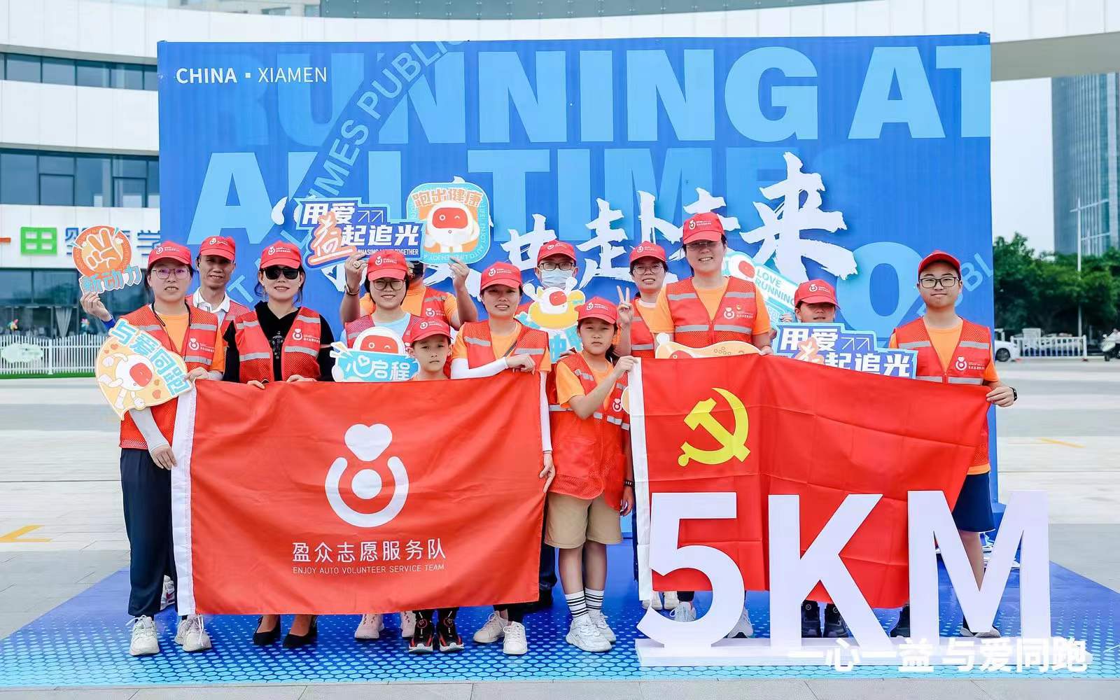 启动当天,在“一心一益 与爱同跑”2023年第二届厦门公益跑活动现场,盈众志愿者队暖心助力,为赛事提供支持与保障;盈众跑团为爱开跑,与医务工作者、癌症患者及家属、广大跑友一起,用笑容和奔跑表达对生活的热爱,践行健康积极的生活方式。