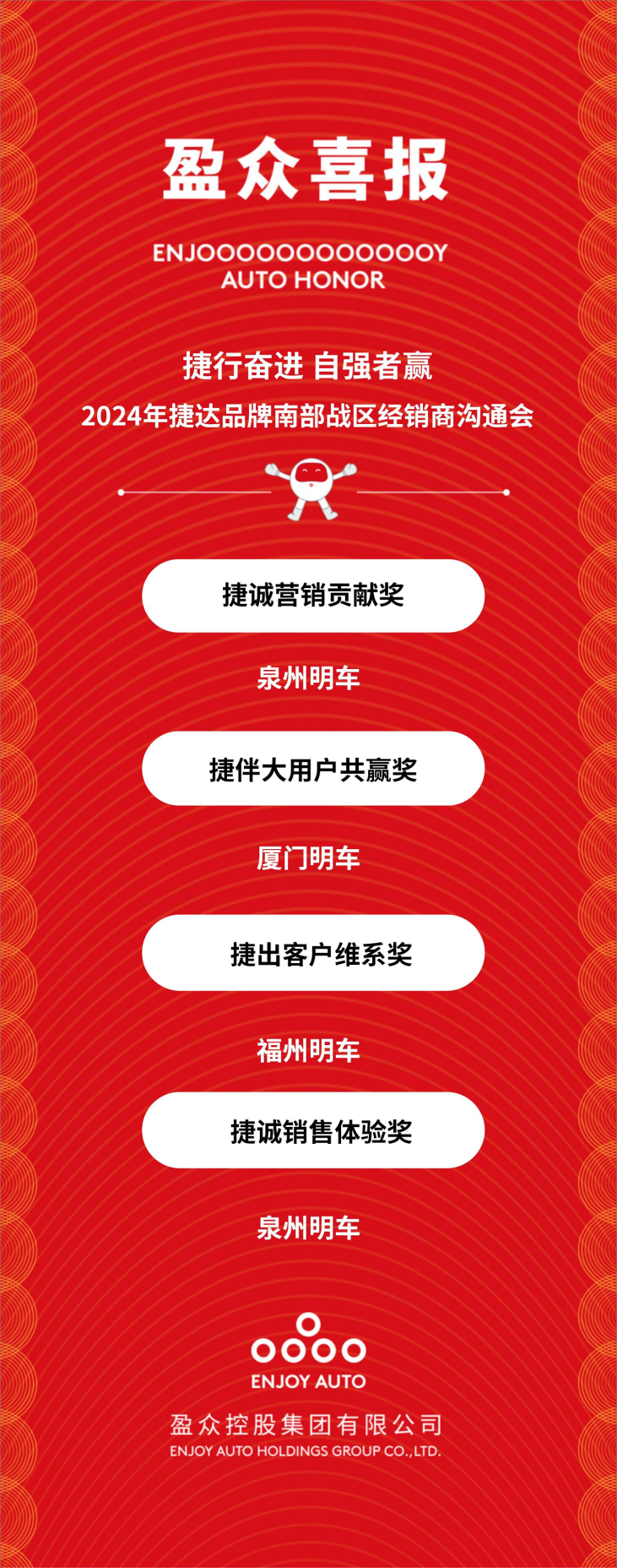 喜报 | 盈众荣获捷达品牌多个团队与个人奖项 2024-03-15 盈众控股集团 11258次浏览 3月14日,以“捷行奋进 自强者赢”为主题的2024捷达品牌南部战区经销商沟通会在海口举办。盈众捷达团队凭借2023年在销售业绩、市场表现、运营管理、大用户拓展等方面的出色表现,荣获“捷诚营销贡献奖”“捷伴大用户共赢奖”“捷出客户维系奖”“捷诚销售体验奖”四个团队奖项。 此次经销商沟通会还对优秀个人进行了隆重的表彰,以榜样的力量激励广大经销商伙伴。盈众捷达团队多个业务岗位的多名优秀员工也获得了个人奖项。 2024年,面对汽车行业发展新趋势与新变化,盈众捷达团队将继续坚持盈众“诚信立足社会 服务创造未来”的经理理念,以永不言弃的精神和敢于拼搏的魄力,拼下市场,提升份额,为捷达车主提供更好的产品与服务。 点赞 2 上一篇 下一篇