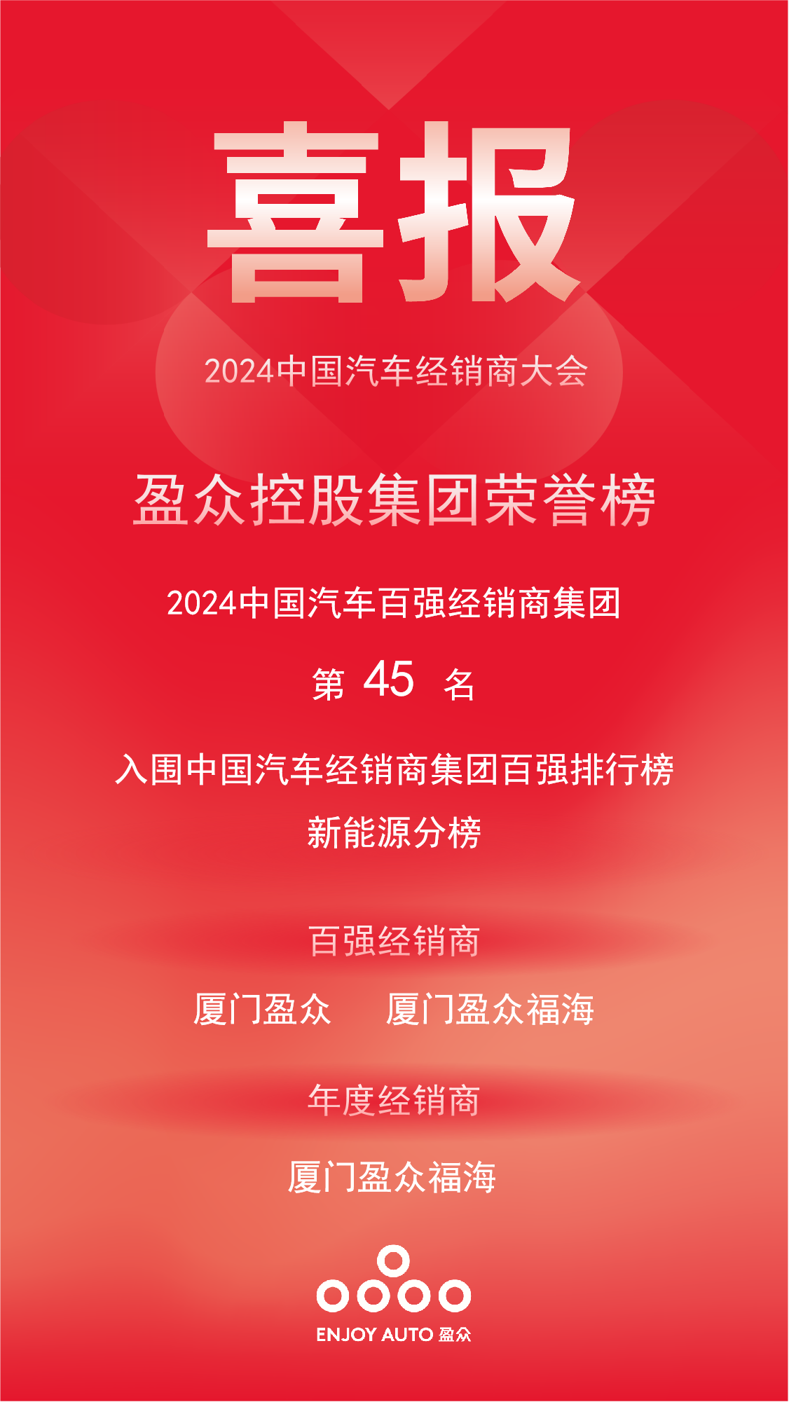 同时,盈众控股集团还入围“2024中国汽车经销商集团百强排行榜新能源分榜单”,旗下厦门盈众及厦门盈众福海荣获“百强经销商”荣誉称号,厦门盈众福海入围“年度经销商”。